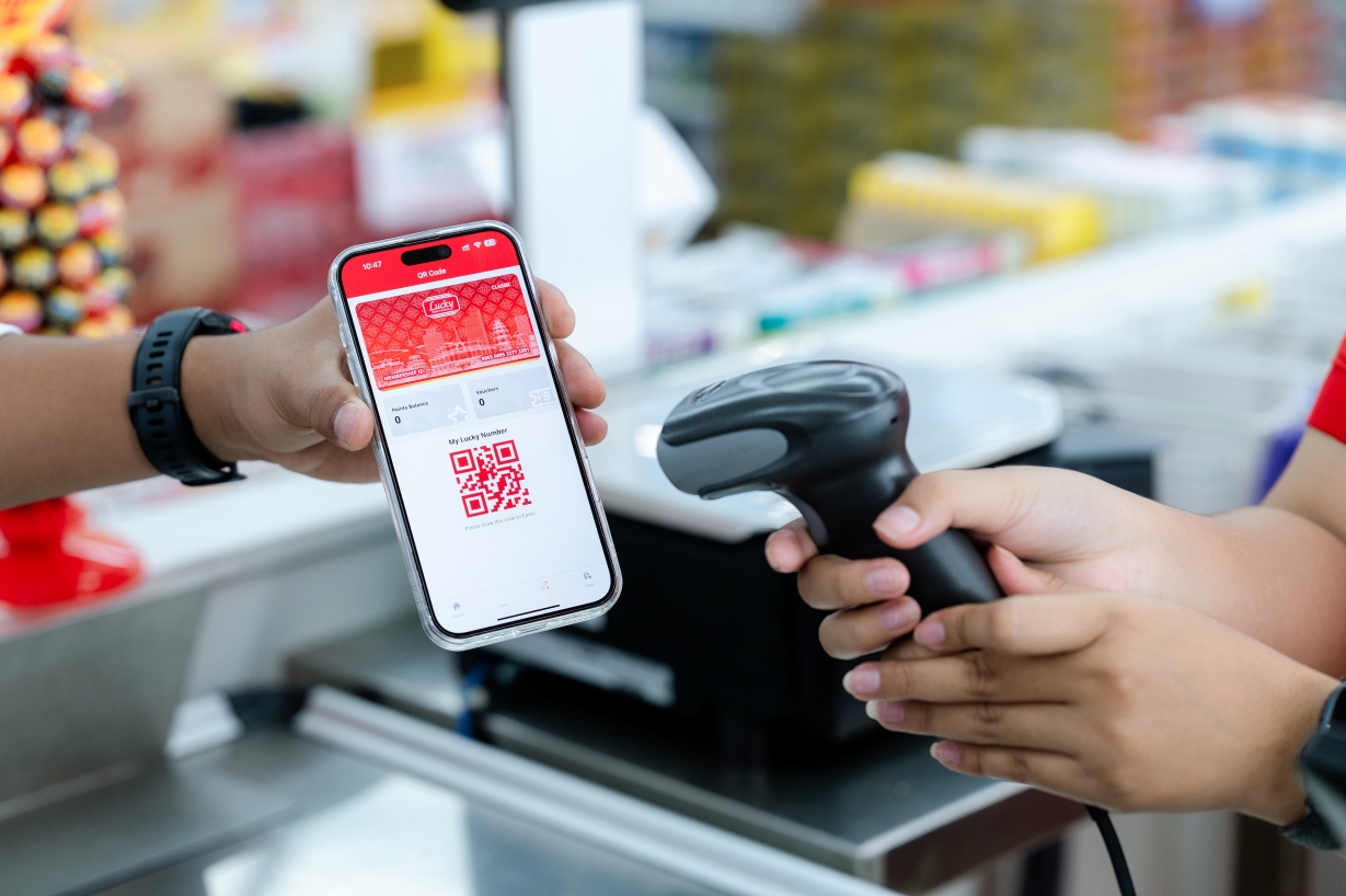 The customer needs to present the QR in their Lucky Reward App to the cashier for scanning (only QR display within the Lucky Reward App is acceptable).